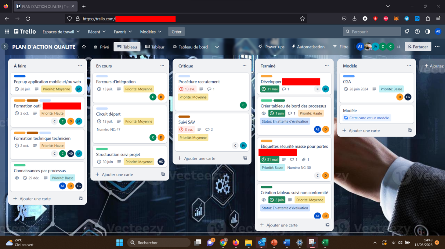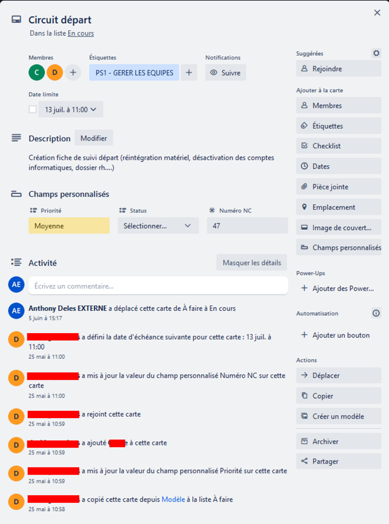 - Colonne 5 : le modèle de base (on peut créer le modèle de carte que l’on souhaite avec les informations à renseigner (nom, processus, statut, délai, acteurs, numéro de NC lié, …)